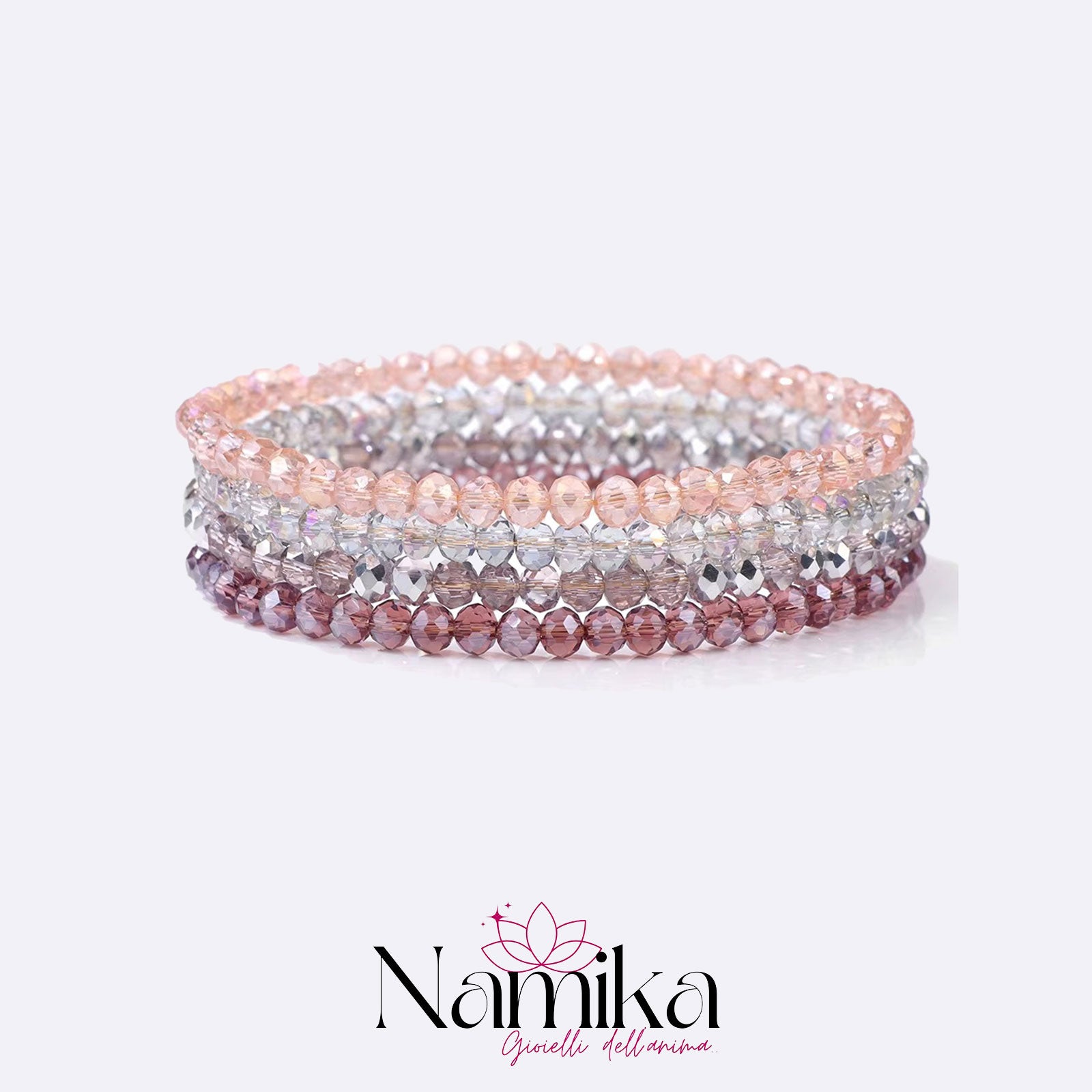 Questo set è composto da 4 bracciali elastici realizzati con perline sfaccettate in cristallo di agata, una pietra apprezzata per la sua naturale lucentezza e le sue proprietà energetiche. Le perline, accuratamente lavorate per esaltarne la brillantezza, si declinano in una raffinata gradazione di colori che spazia dal rosa cipria al trasparente argentato, fino al lilla chiaro e al malva.