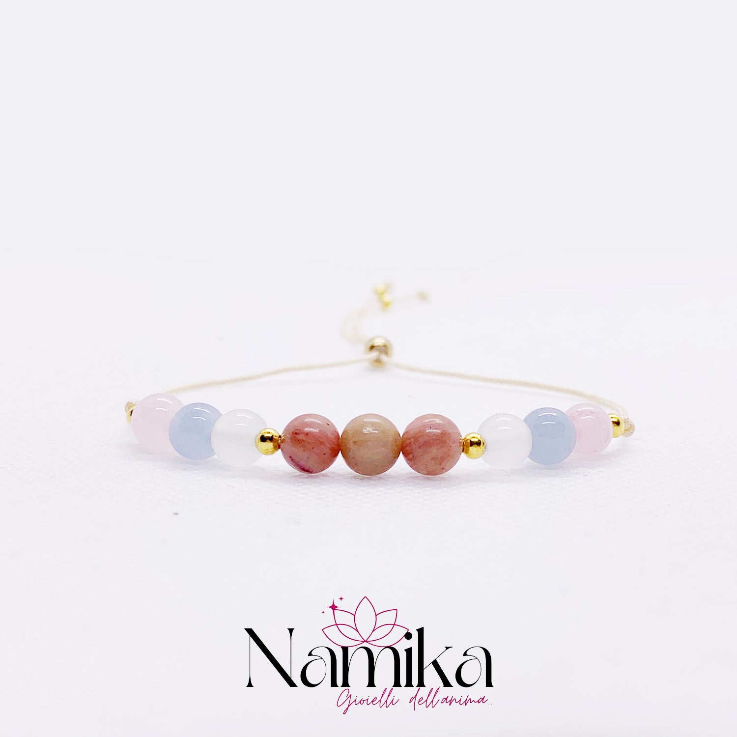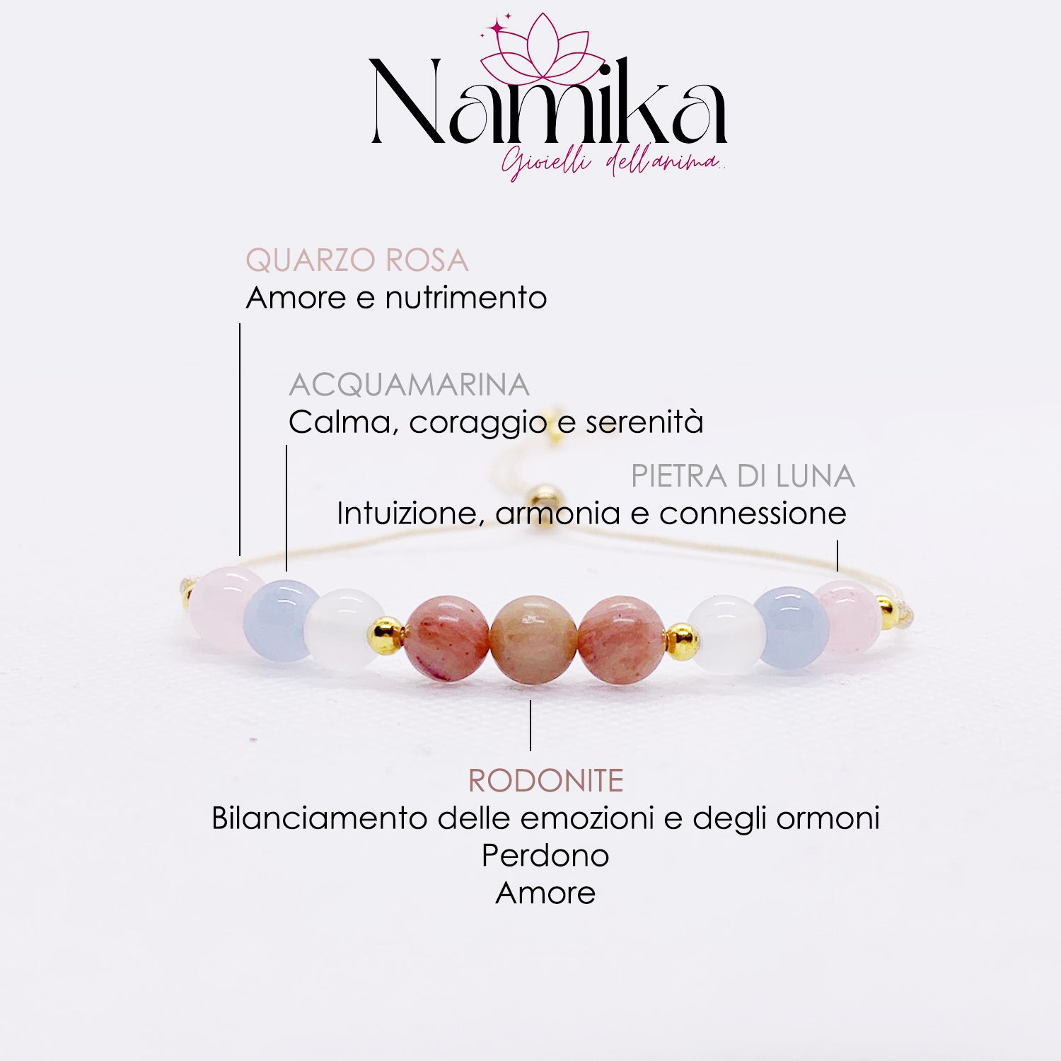 Immersi in una luce delicata, i toni soft delle perline naturali di Rodonite, Quarzo Rosa, Acquamarina e Pietra di Luna raccontano una storia di accoglienza e fiducia. Ogni pietra è scelta con cura per accompagnare il percorso della gravidanza con dolcezza, armonia e speranza.