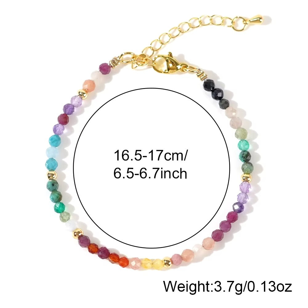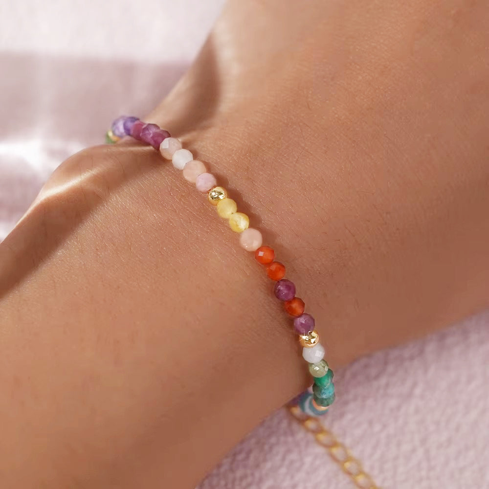 Bracciale delicato e colorato, realizzato con pietre naturali sfaccettate e piccole perline dorate . La sequenza di tonalità è equilibrata e vivace, ideale per aggiungere un tocco di colore a qualsiasi outfit.